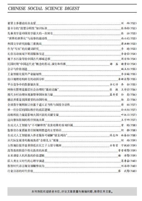 《中国社会科学文摘》由中国社会科学院主理,,,,,,是大型综合性社会科学文摘期刊。。。。。它荟萃天下主要社科期刊英华,,,,,,精选转载哲学社会科学各学科前沿效果,,,,,,是相识中国学术动态和政策研究的主要窗口。。。。。《中国社会科学文摘》与《新华文摘》《高等学校文科学术文摘》和《人大复印报刊资料》并列我国人文社科领域最具权威性的二次文献转载平台,,,,,,以筛选、转载高质量学术论文为主要功效,,,,,,在学术界享有极高声誉。。。。。(审稿 刘卫民 金诗灿)