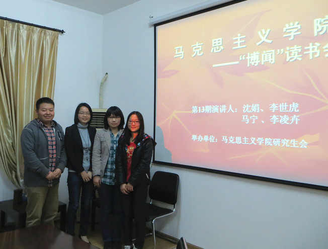 2013年4月3日晚,,,,,,uu电玩官网第13期“博闻念书会”在uu电玩官网聚会室顺遂举行。。。。。。。本期念书会由uu电玩官网研究生会学术部部长孙梓毓主持,,,,,,并组织学院研究生起劲加入。。。。。。。本期念书会的主讲人划分是来自我院的李世虎、沈娟同砚以及法商学院的李凌卉、马宁同砚。。。。。。。四位同砚以“学习党的十八大精神”为主题划分做了精彩的报告,,,,,,并与同砚们举行了现场交流。。。。。。。