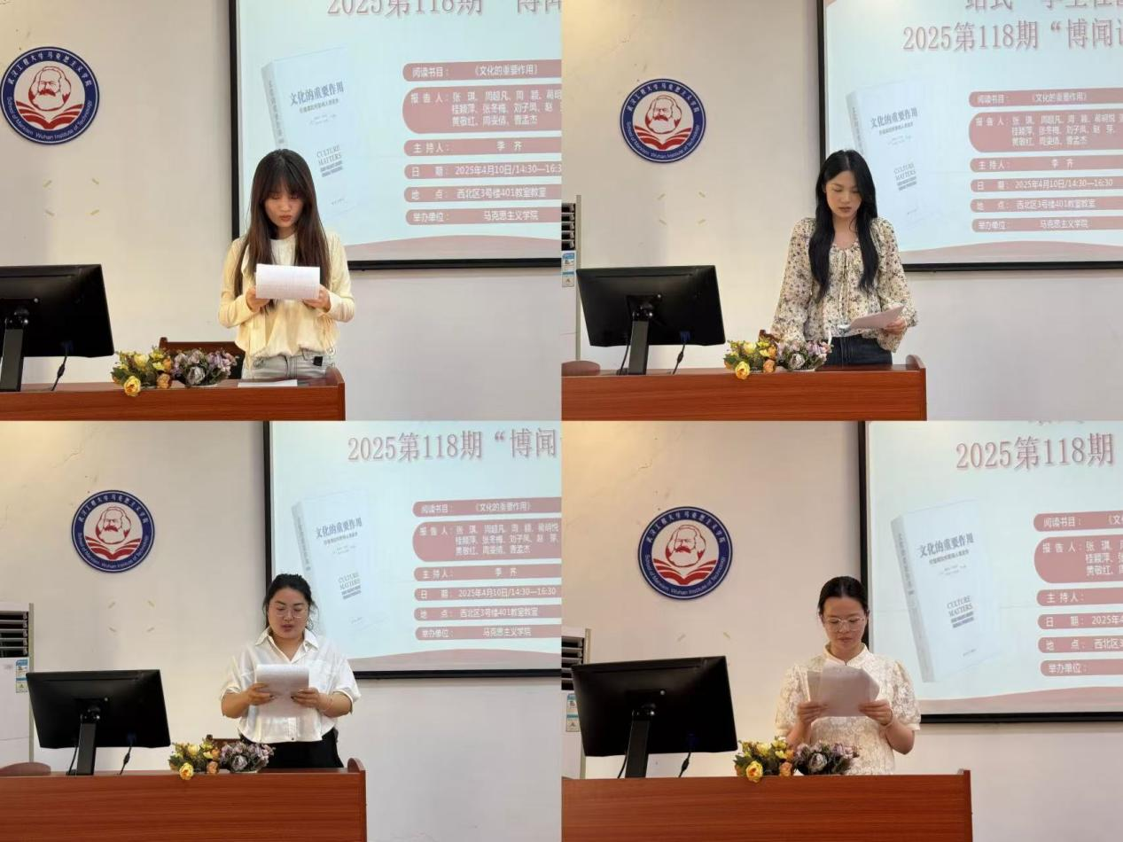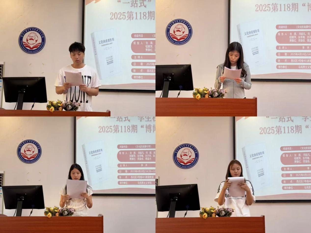 本网讯(通讯员 刘欣 张洋洋)4月10号下昼,,,,,,,我院第118期“博闻念书会”在uu电玩官网一站式学生社区中心(求是楼401课堂)顺遂召开。。。。。。。本次念书会围绕着亨廷顿、哈里森的著作《文化的主要作用》睁开讨论。。。。。。。本次念书会由李齐先生主持。。。。。。。加入此次念书会的11位研究生主讲人为24级周雯情、张琪、周颖、周超凡、黄敬红、曹孟杰、刘子凤、张冬梅、葛明悦 、桂颖萍、赵芽。。。。。。。院学术部“博闻念书会”运动小组组织了此次念书会。。。。。。。