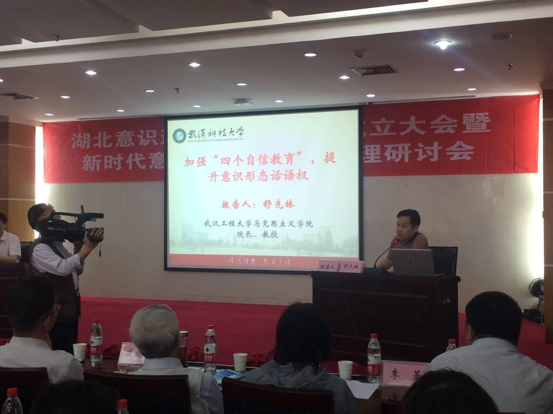 我院舒先林教授在大会上受聘为湖北意识形态建设研究院咨询专家,,,,,,,并作了题为《增强“四个自信”教育,,,,,,,提升意识形态话语权》的专题报告。。。。。报告以为:思政课西席是高校意识形态建设的主力军,,,,,,,在教育教学历程中,,,,,,,一定要树立责恣意识、阵地意识和问题意识;;;;;;;;高校主流意识形态内在建设应围绕“四个自信”睁开,,,,,,,思政课教育教学必需增强盛学生对“四个自信”的明确和认同;;;;;;;;“四个自信”背后的逻辑现实上是“价值自信”,,,,,,,要通过增强“四个自信”教育推进马克思主义中国化时代化公共化,,,,,,,提升国际话语权。。。。。