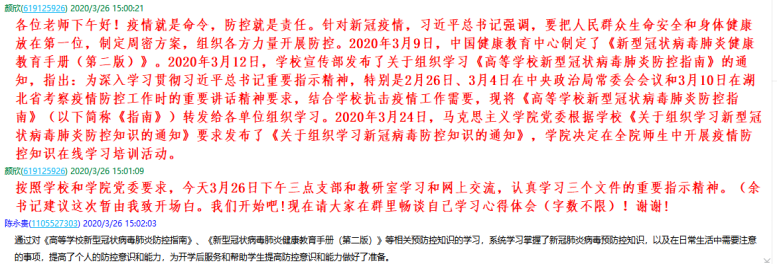 2020年3月26日(周四)下昼,,,,,“纲要”党支部书记施亚利在“红太阳—武工纲要要党支部”QQ群上,,,,,安排了学习使命,,,,,要求各成员凭证马院“学习防控知识通知”要求,,,,,重点学习了《手册》、《指南》。。。。。阻止3月28日晚,,,,,“纲要”党支部列位成员经由认真学习,,,,,撰写了学习的心得体会,,,,,并提交给支部书记。。。。。