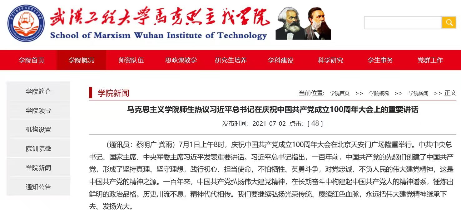 学院举行了形式多样的学习分享会。。。。。。。院长曹胜亮第一时间撰写了题为“斗争百年路 启航新征程”的学习心得,,,,,,从“党的绚烂历史照亮未来”“党的基础宗旨始终切记”“伟大建党精神特出千秋”等三个方面分享体会,,,,,,泛论感想。。。。。。。他指出,,,,,,宽大党员干部要时刻不忘党的基础宗旨,,,,,,以为民务实清廉的现实验动为伟大的为人民服务事业斗争终生。。。。。。。7月2日,,,,,,湖北高校思政网对我省教育系统学习习近平总书记讲话精神的总体情形作了集中报道,,,,,,曹院长的学习体会被收入其中。。。。。。。
