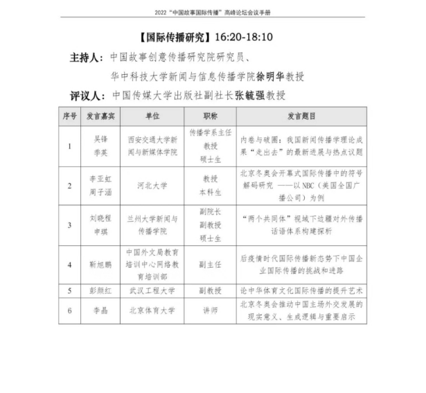 (通讯员蔡明广)5月14日-15日,,,,,,,,2022中国故事国际撒播岑岭论坛在华中科技大学举行,,,,,,,,我院副教授彭颜红博士向导硕士研究生加入聚会 。。。。。。