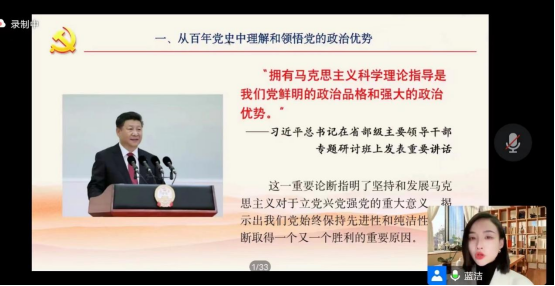 首先,,,,,,,兰洁博士分享了中国1921-2021百年沧桑历史巨变的相关视频,,,,,,,凭证党的二十大报告中对中国式现代化的讲述,,,,,,,引出课程的第一个主题——从百年党史中明确和意会党的政治优势。。。。。。。兰洁博士从救国大业、兴国大业、富国大业和强国大业四个角度出发,,,,,,,引用党史人物及主要聚会的相关讲话,,,,,,,解说了中国共产党向导人民完成新民主主义革命,,,,,,,建设中华人民共和国;;;;;;确立社会主义基本制度,,,,,,,推进社会主义建设;;;;;;举行刷新开放伟大革命,,,,,,,极大解放生长生产力;;;;;;争取新时代中国特色社会主义伟大胜利的一系列卓越效果。。。。。。。