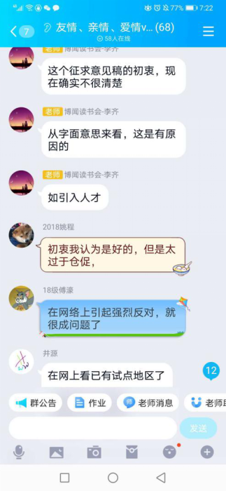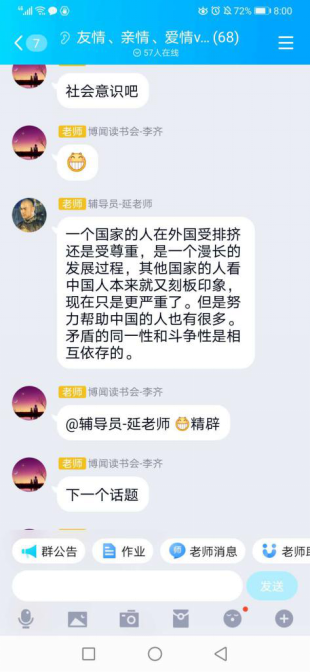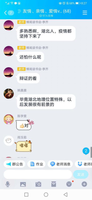 在以“友情、亲情、恋爱VS疫情”命名的QQ群中,,,,,,李齐先生与延飞先生向导同砚们知无不言,,,,,,分享自己的念书心得与感悟。。。。。涉及的话题从外国人永居条例到网络羁系,,,,,,从医患关系与疫情后湖北省就业问题,,,,,,短短两个多小时,,,,,,讲话达几千条,,,,,,同砚们收获满满。。。。。